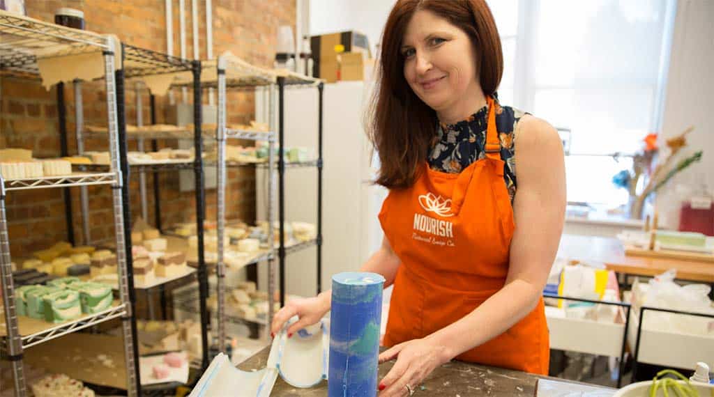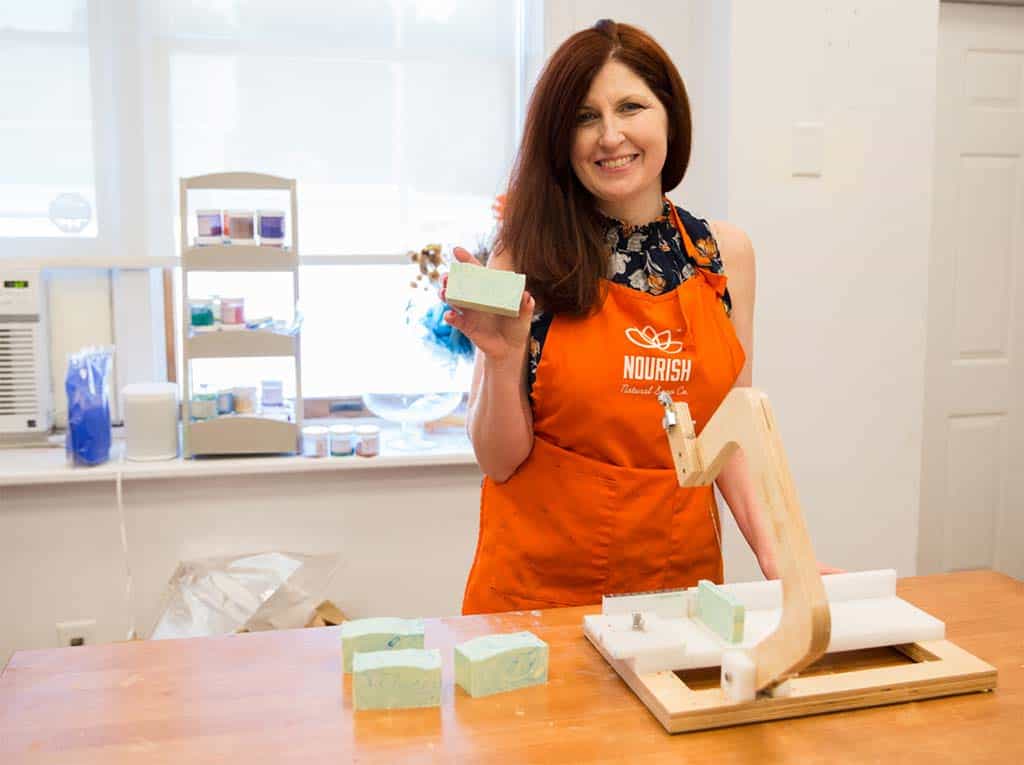 Nourish is still a start-up, Feighan says, and she couldn’t be happier with her journey so far. “I love the happiness that our products bring people,” she says. “So many people send me notes or come in telling me how we cured their rash, or that they no longer need to use lotion because our soap is so moisturizing. I love when someone has never found anything that worked for their extreme case of eczema or for their sensitive skin, and then our product worked. In addition, I feel so grateful that so many people love our stuff so much that they want to buy it for all their gifts. It is so amazing how we continue to organically grow this way.” Becoming an independent entrepreneur has been a learning experience and, as anyone who knows can tell you, a veritable ton of work. “My role is really everything,” Feighan says. “From soap maker to shopkeeper, to strategy, product development, and marketing. I love the ability to make something that is our own, that we made from scratch by hand. Sometimes I cannot even believe that people want to buy all these things that I make.”