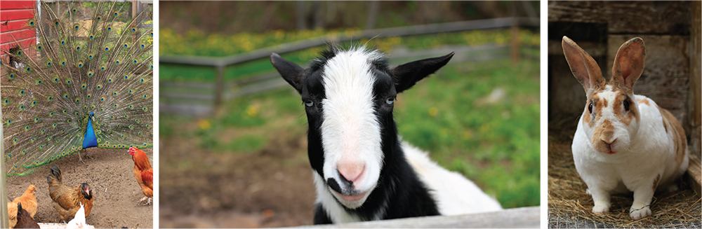 Chickens, ducks, peacocks, pigs, miniature horses, and fainting goats are among the farm rescue sanctuary in the looking zoo at