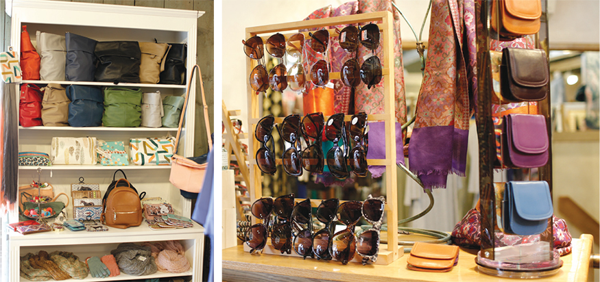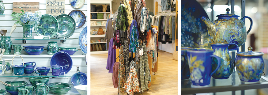 of their own, returning to a place where friends meet and talk, made welcome by Jessica and Kelly Covert, who are the new generation representing our vision. “The clothing department is a huge part of our survival; we’ve developed a large base of people who do a lot of their clothing shopping here,” says Melinda. “Jewelry is also strong. The downstairs, the pottery and glass, may not be as huge but it’s the core—handcrafted work is what drives us, and everything has to work with that.”