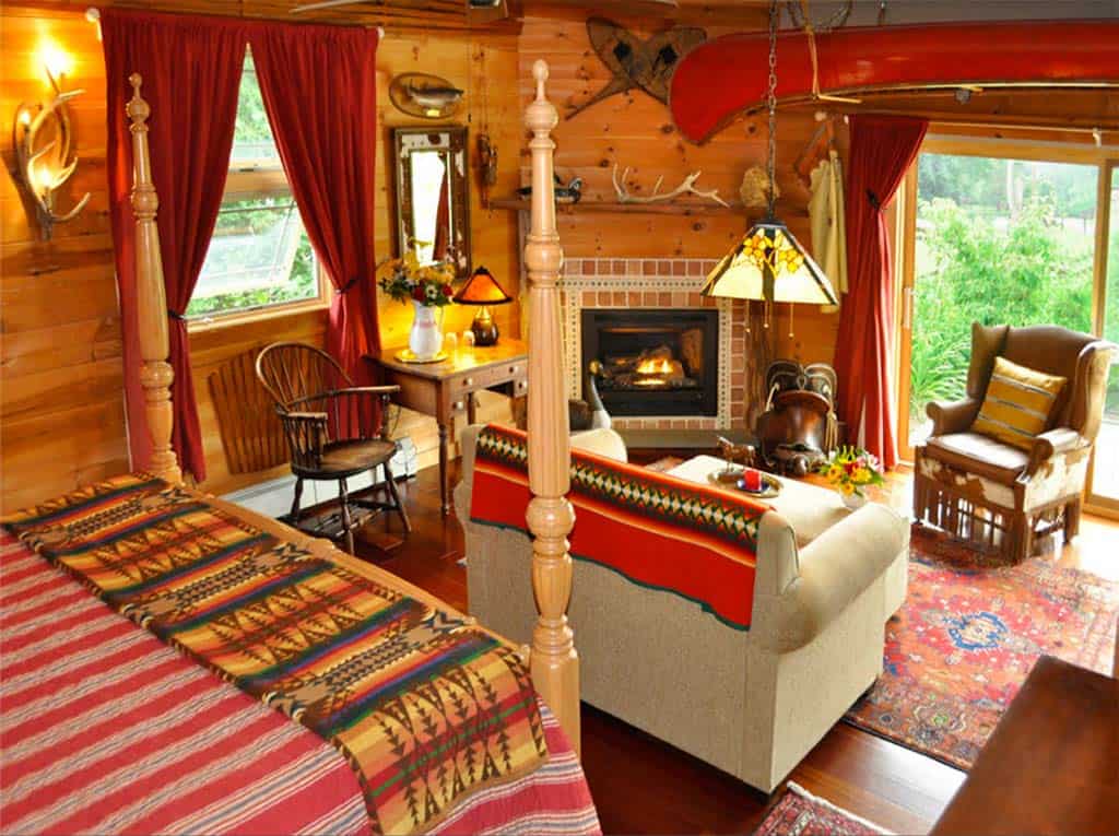 “I grew up in the northern Catskills and you can see the Adirondack influences from my childhood,” she says, “and I’m a lover of the rich colors you find in Pendleton blankets and Oriental rugs. I also love collecting Northwestern American Indian articles, and cowboy paraphernalia, and what I collect goes up on the walls.