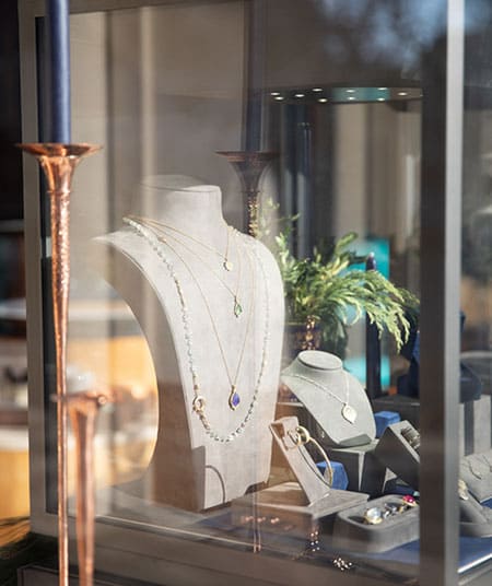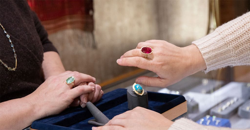 “It felt different than just giving a stranger your phone number,” Jacobson laughs. One thing led to another, and soon the pair were living together in Brooklyn. Chefridi felt deeply drawn to gemstones and to creativity, so he began experimenting and studied at the Gemological Institute of America and at the Studio Jewelers School. His work soon outgrew their Brooklyn apartment’s kitchen table. “Corinne helped me with all the technicalities of running a business,” says Chefridi. The first showroom was in Soho, and after years at various makers’ marts, he began working with retailers in 2008. Soon after, the pair relocated upstate, opening a shop in their hometown of Woodstock, then in Kingston, and finally finding the right spot in Rhinebeck. “Rhinebeck is the perfect place,” says Chefridi. “It’s full of people who admire and value beauty and creativity.”