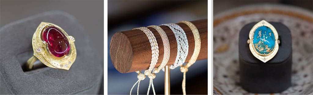 This region of ours is a wonderful place to be if you’re thirsty for beauty; it’s everywhere you turn, in many flavors. If you love the sparkling kind of beauty that comes about when humans lend their creativity to sapphire, ruby, and turquoise stones set in precious metals, you owe yourself a trip to Adel Chefridi Fine Jewelry Studio & Gallery in Rhinebeck. “ We’re primarily a design studio,” says Corinne Jacobson, who manages the store’s day-to-day while her business and life partner Chefridi designs and crafts the pieces. “The core of this work is searching for new expressions and helping people find unique manifestations for their innermost feelings, designing and making unique jewelry pieces inspired by the intercultural heritage of the human imagination and driven by contemporary lifestyle.”