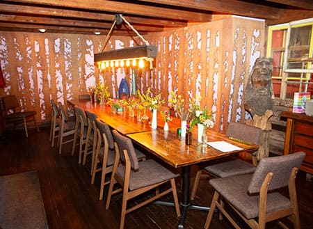 Part of the strategy was refining their outdoor dining game, and their much-loved deck is now cozily enclosed on three sides, with string lights and heaters for chilly evenings. “All of our cooks came outside and built it themselves,” says Marybeth. “Everybody was part of it. People came in and rolled up their sleeves and said, ‘Let’s do it,’ and you had people who normally cook for a living nailing down corrugated plastic ceilings and stuff. It was a lovely time, and we’re very grateful for the way our team stuck with us. So now we have this gorgeous outdoor seating that’s much like the inside—taxidermy and mismatched oriental rugs, deep plush lounge chairs. It’s kind of a magical spot now.”