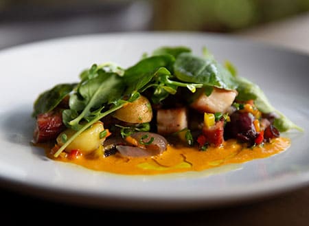 “We despise pretense, so things aren’t plated with micro garnishes arranged with tweezers.” Besides the dining room, there’s a tavern with its own pub grub menu.