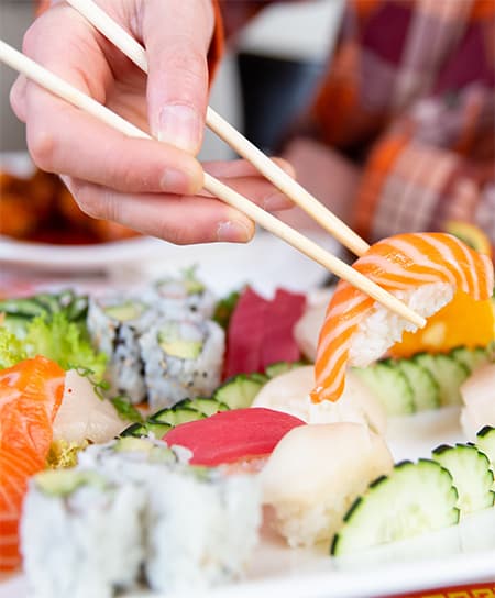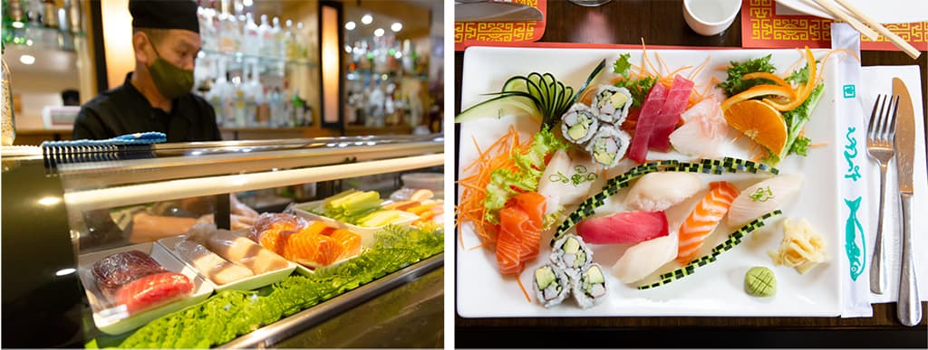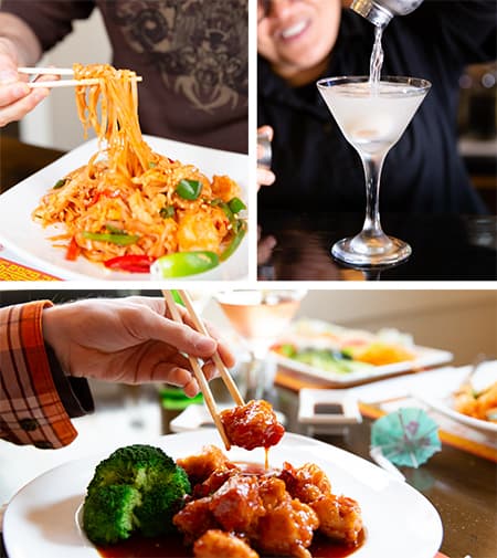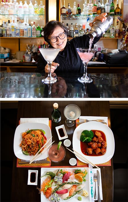 The pan-Asian bistro is true to Aw’s ideals, offering familiar Chinese classics, sushi, sashimi, Thai, and Japanese delicacies along with a full bar. There are vegetarian dishes, gluten-free options, and “Revolution Diet” dishes prepared without oil or cornstarch. There are a dozen cooked and half-a-dozen raw varieties of Maki rolls (hand-rolled is an option) and another 14 choices of House Special rolls: from the Golden Sweet Potato Tempura Avocado Roll to the Out of Control Roll (spicy tuna mango roll; topped with salmon and avocado, honey lemon sauce, and red tobiko).