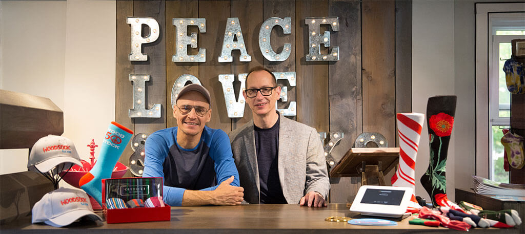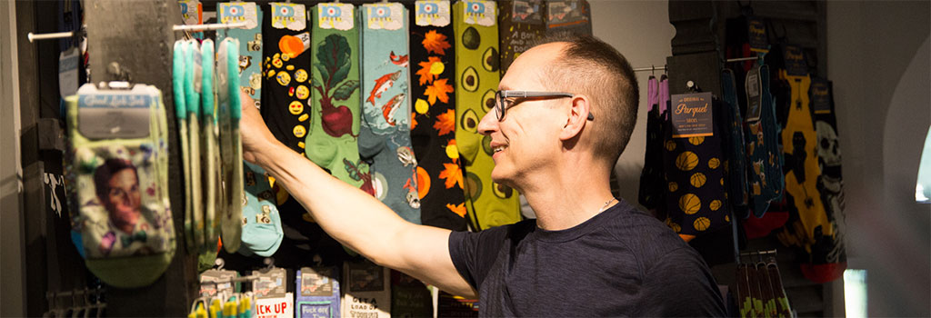 Roman says. “We found an awesome sign maker and employed some tried-and-true tactics to increase visibility with flags and a sandwich board. Our marketing strategy also includes a mix of print and online advertising, and a robust social media and SEO campaign.” Woodsock and Woodstock are a natural fit, thanks to Roman and Richard’s intuitive understanding of what kind of sock shop the town needed. “We endeavor to bring some color and levity to people’s lives with the most fun and fabulous novelty socks around,” says Roman. “This is reflected in our buying strategy by steadily increasing our selection of socks and regularly introducing new brands. Offering friendly and very genuine customer service has been an overriding priority since we opened our doors—making tourists and visitors feel wanted and welcome, and building relationships with the locals as they discover the new sock shop in town. We are proudly gay-owned and operated, and fly the Stars and Stripes and a Pride flag at the shop every day.”