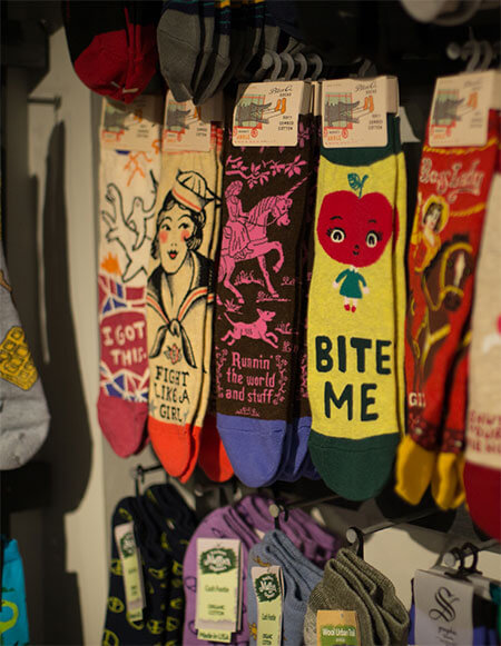 On Saturday, May 19, 2018, Woodsock opened its doors to the amusement and delight of visitors and locals alike. Word spread quickly. “We focused on visibility—to have as strong a presence on Tinker Street as possible, making sure that if people were looking for us they could find us, and folks driving or walking down the street would know that if they wanted fun socks, this was the place,”