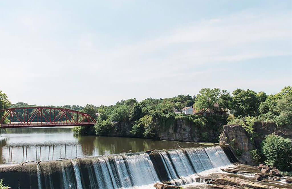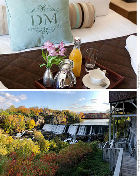 Locals watched in amazement as a brick and stone fortress took shape on a bluff overlooking the Esopus Creek, on the former site of the Martin Cantine Paper Mill. The Diamond Mills Hotel & Tavern complex, which opened in late 2011, covers 64,115 square feet and rises four stories tall. The tech-smart event space can hold over 400 for a dream wedding, corporate conference, or gala for a good cause. Soaring ceilings, natural light, sweeping vistas, unique fixtures, and roaring falls make for one-of-a-kind memories and the photos to go with them. Each of the thirty rooms offers a private balcony with a water view.