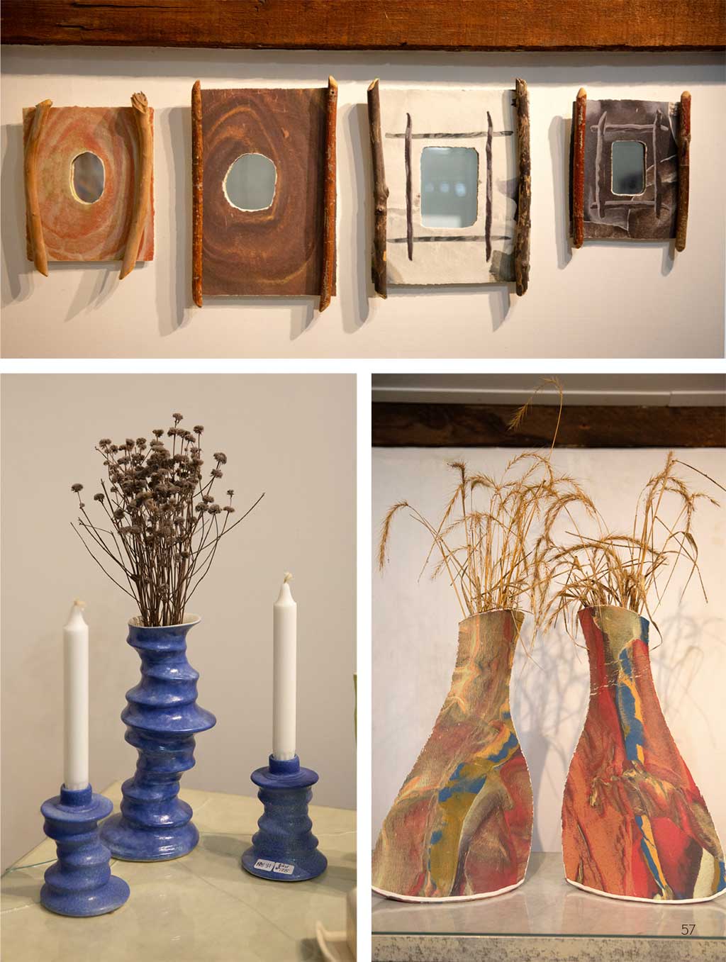 “I’m going to be showing some of my teapots. They used to be my signature pieces, and they’re mature, so I’m excited about that. And two years ago, I was able to take over the downstairs area of the studio building as a gallery here in High Falls and show a whole body of work that I didn’t have room for upstairs: mixed media pieces composed of river wood from the Rondout Creek combined with porcelain. So now I have an entire wall of them.”