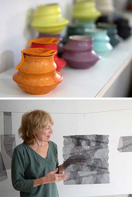 Born in Boston, she grew up in Princeton, NJ and discovered a gift for languages while living abroad in Belgium with her family at age 11. At Swarthmore, she majored in French literature, the better to spend her junior year abroad. “Swarthmore had a ceramics studio, and I’d never been in one before, and it just really made a huge impression,” she says. “We didn’t have art classes for credit, so I did a lot of extracurricular time in the studio, and there happened to be a gifted teacher named Paulus Berensohn. One thing led to another, and he became my mentor and lifelong friend, and I believe he got me a scholarship to Penland [School of Crafts, in North Carolina’s Blue Ridge Mountains].”