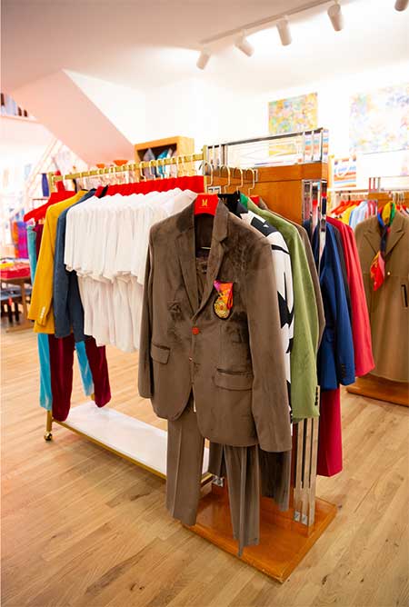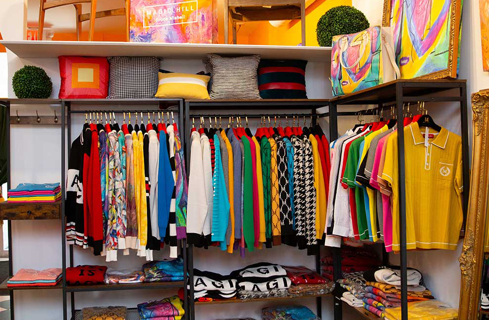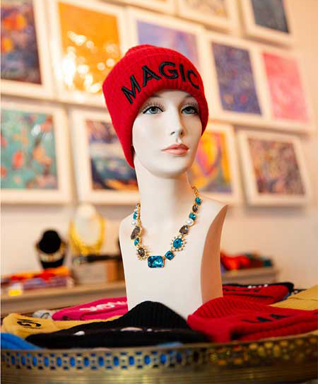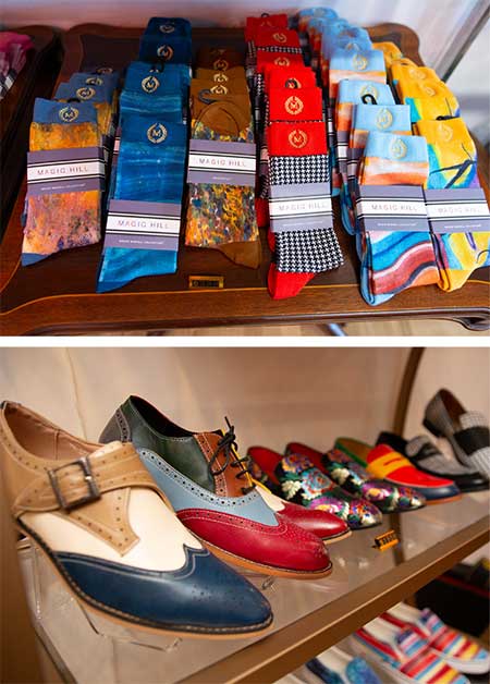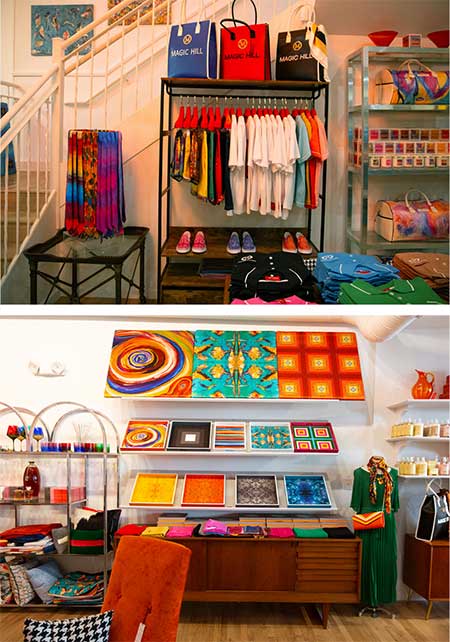 You will get a warm welcome at the Kingston outpost of Magic Hill Mercantile: It’s the newer of two stores that have been dreamed into existence by Bruce Mishell and Maor Shefer, best friends whose creative partnership has birthed bountiful beauty. “A lot of what you see is based on my artwork,” says Mishell. “Those are posters of my paintings, and on the top there are my silk scarves—we frame them so people can see what they look like. They’re mulberry silk—we use very high-quality fabrics in all our fashion. Maor designs the pieces, and we have them made all over the world, in Italy and China and Vietnam.… We started putting the art on those lacquer trays, then came coasters, and then the fashion, everything from ties to socks to sweatshirts. Then there are the pillows…”